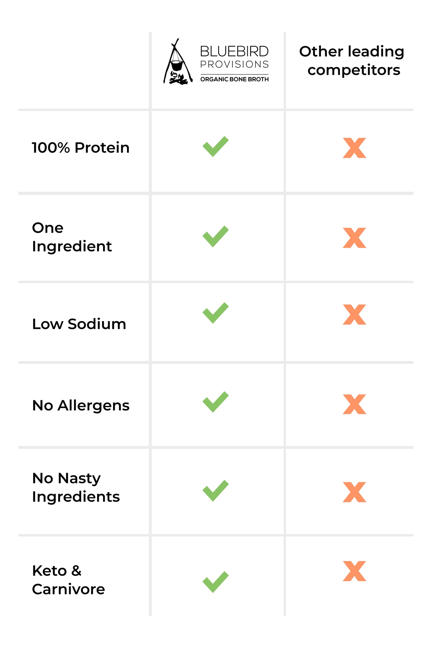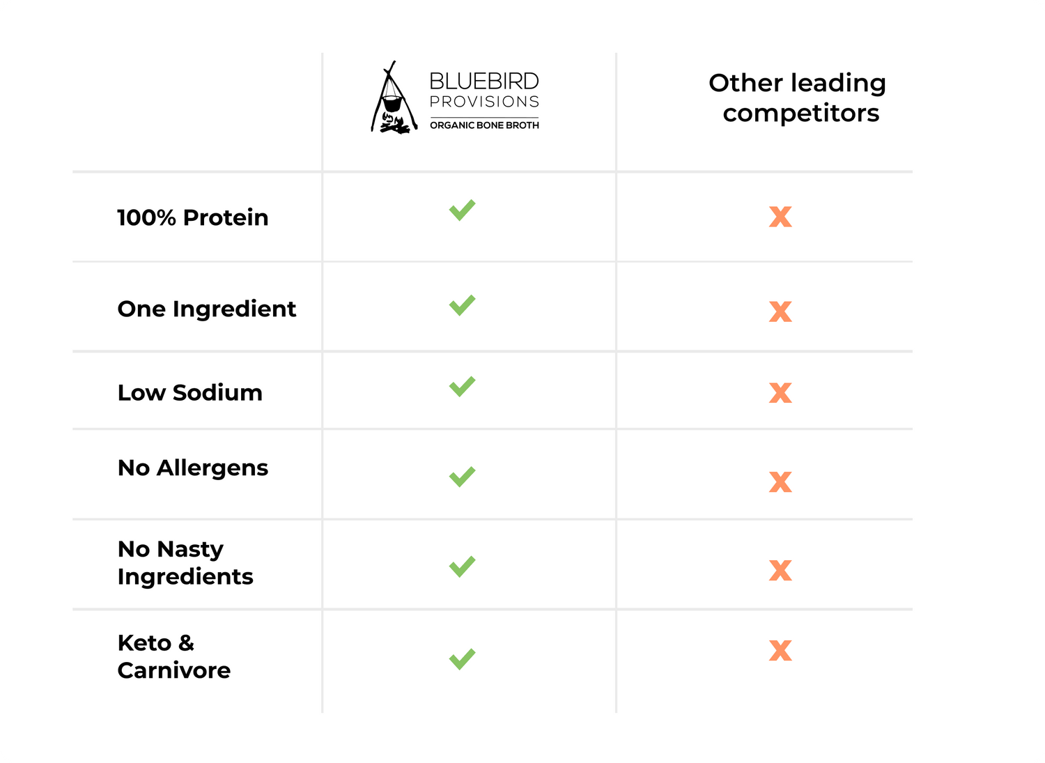 We're the only bone broth powder with 95+% protein, low sodium and no nasty ingredients.