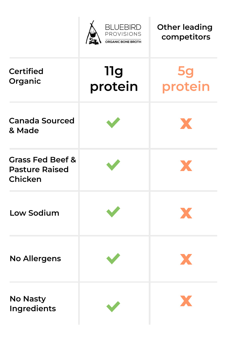 We are Canada's only Certified Organic bone broth with 8-11 g protein and no nasty ingredients.